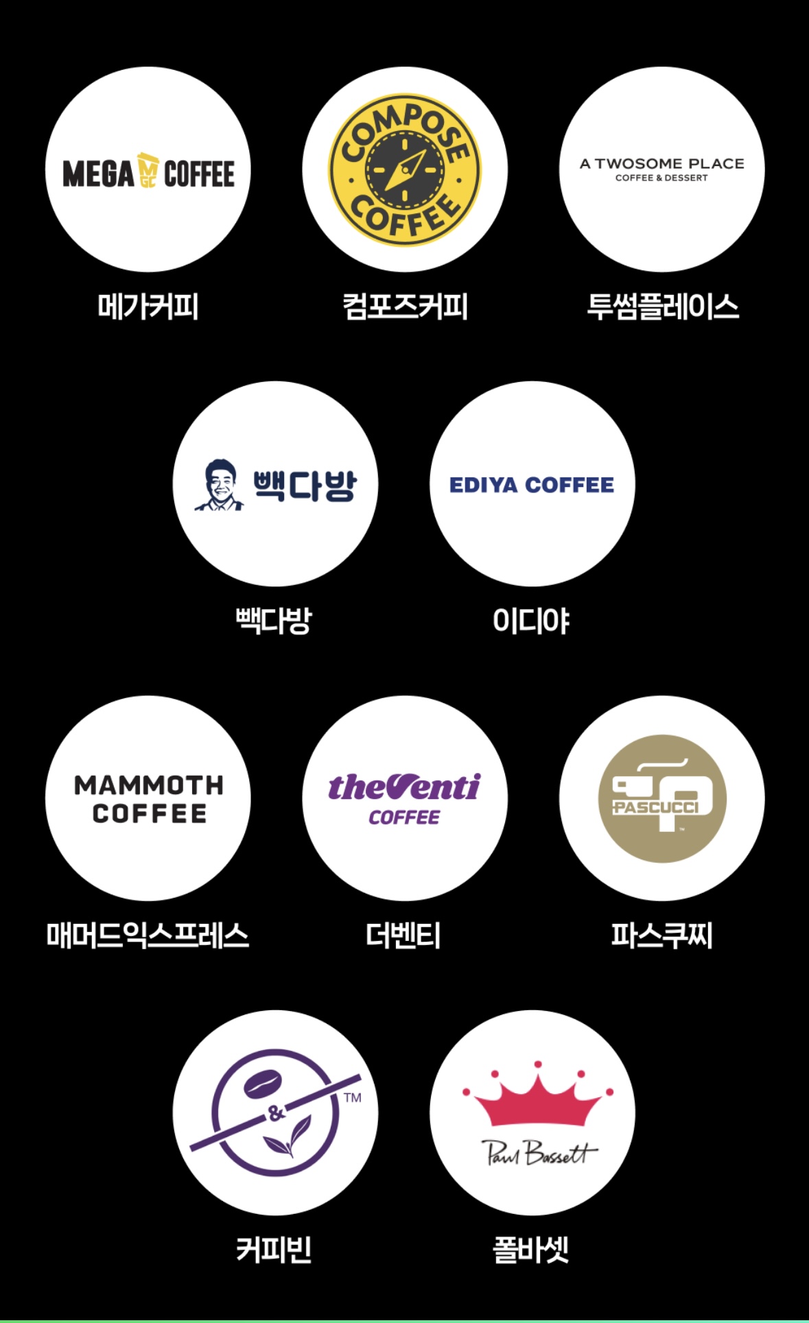 메가커피, 컴포즈커피, 투썸플레이스, 빽다방, 이디야, 매머드익스프레스, 더벤티, 파스쿠찌, 커피빈, 폴바셋
