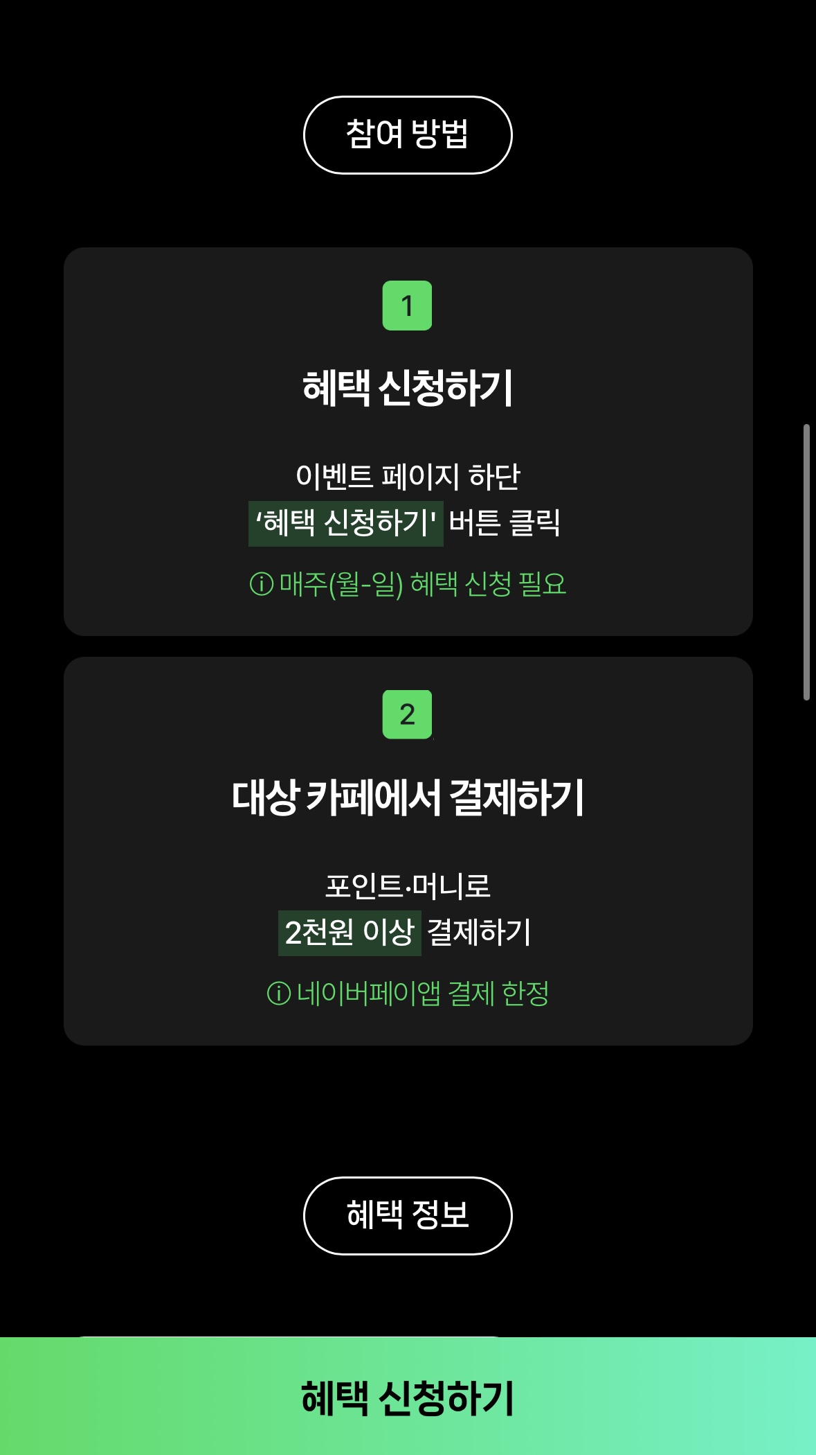 2. 최대 5천원 매주 카페에서 클릭 후 이벤트 페이지 하단 '혜택 신청하기' 클릭하기