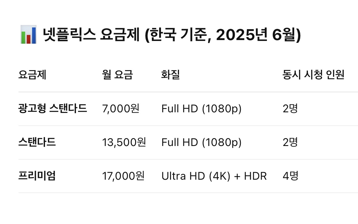 2025년 현재, 넷플릭스의 주요 요금제는 다음과 같이 구분됩니다. (국가별로 다소 차이가 있을 수 있음)
